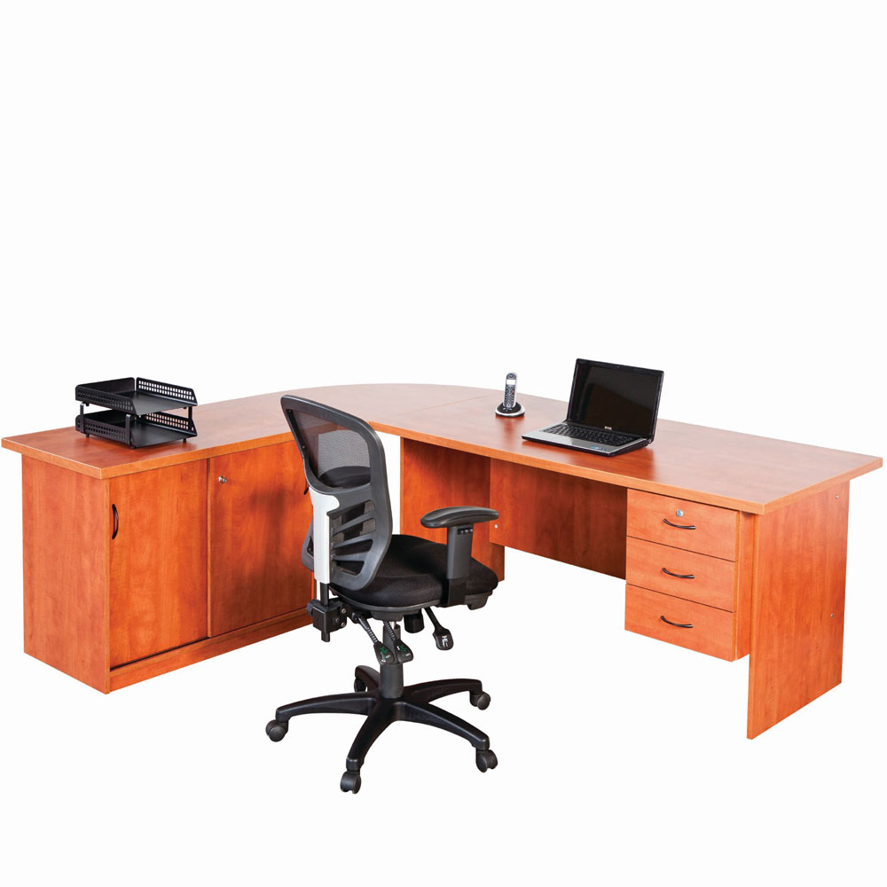 Melamine 32mm top with 32 x 2mm impact edge Desk Shell with 3 Drawer Fixed Pedestal 90° 1200 x 600 Sliding Door Credenza