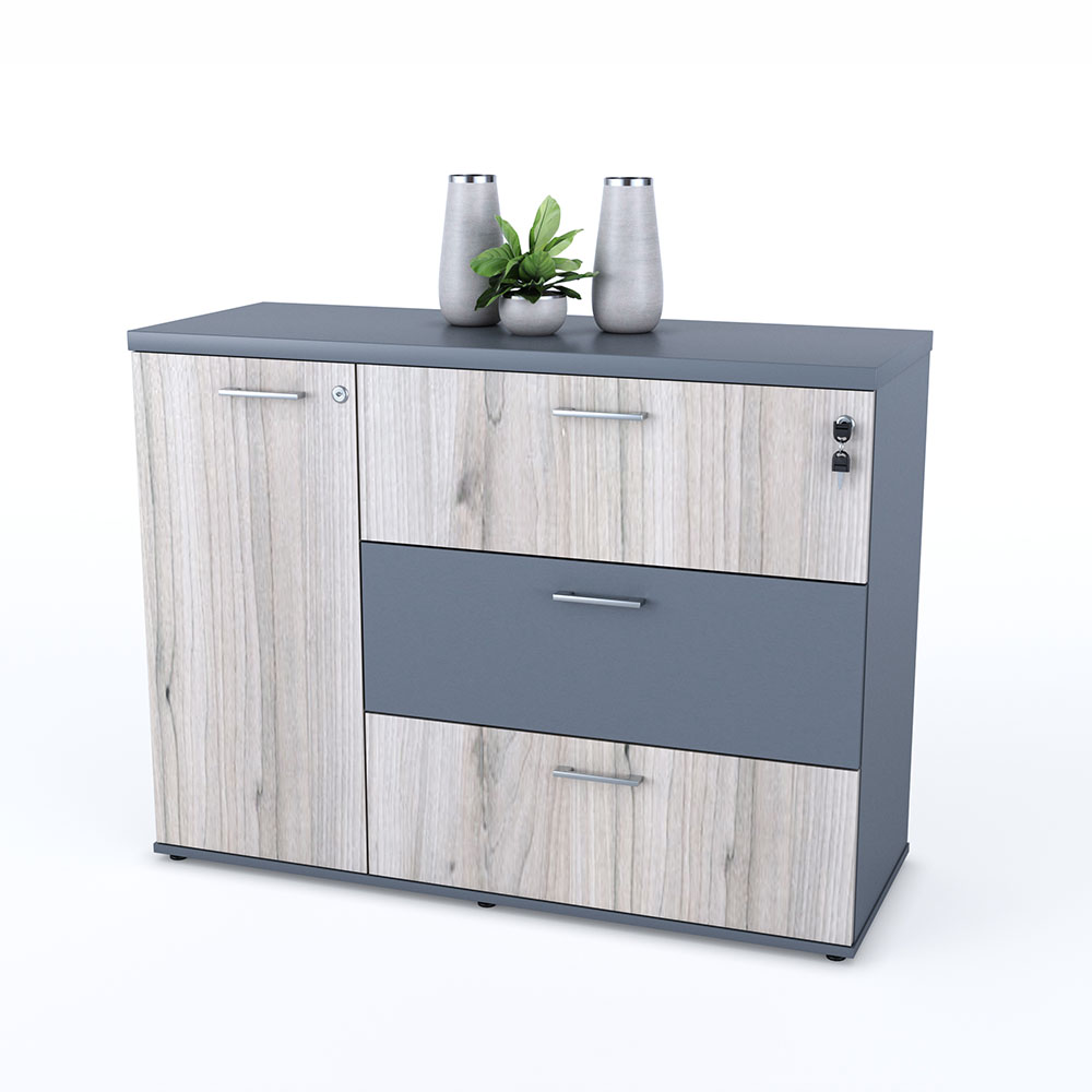 1200w x 450d x 900h Consists of a Single Hinge Door Cupboard with 2 Shelves and 3 Drawer Units