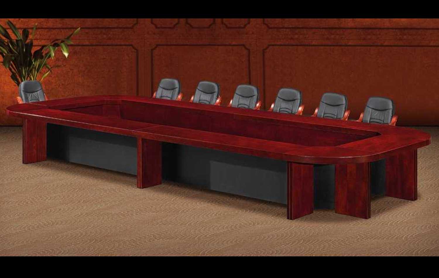 This boardroom table is made of mahogany veneer finish and it has a 70mm thick top. The double layer top gives you extra space for your books and stationery. It has sand blasted glass inlay in the center as well as aluminium cable or speaker wholes and seats 14.
